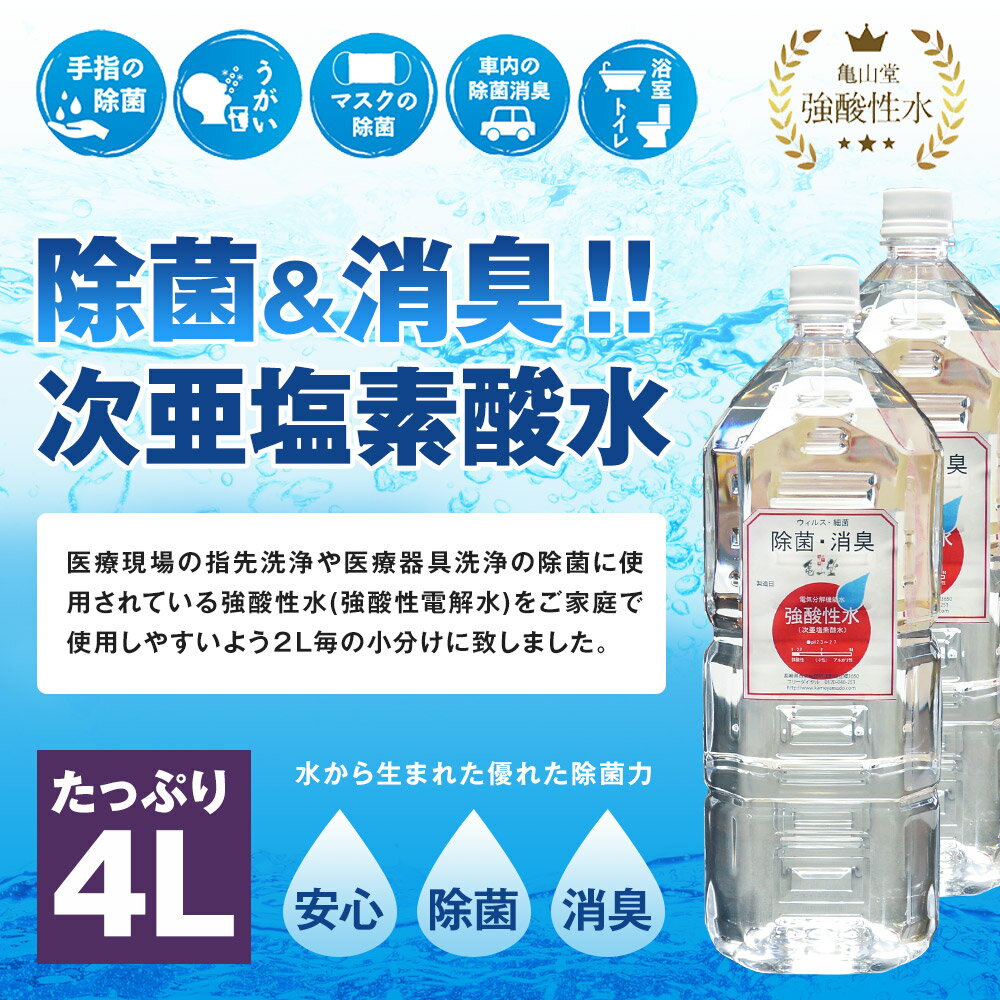 名称 亀山堂 強酸性水 (次亜塩素酸水) 内容量 2L×2本 原材料 水、塩 保存方法 冷暗所もしくは冷蔵庫で保管してください。